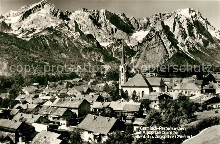 AK / Ansichtskarte Garmisch Partenkirchen Stadtbild mit Kirche Blick zur Alpspitze Hoellental und Zugspitze Wettersteingebirge Garmisch Partenkirchen
