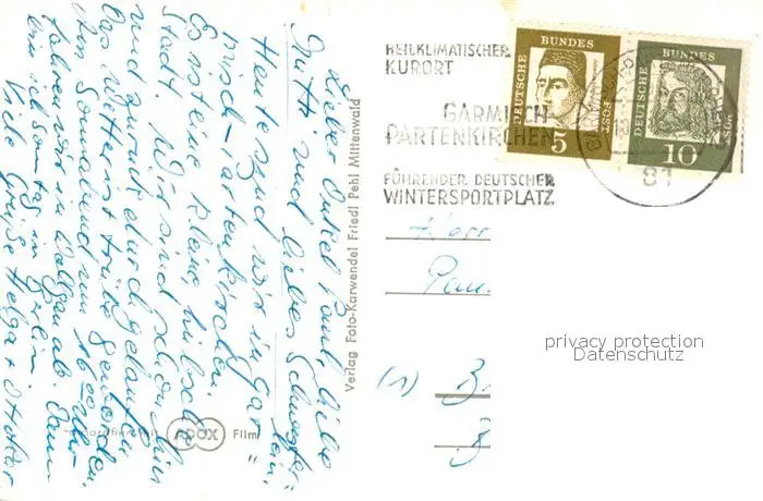 Garmisch-Partenkirchen Stadtbild mit Kirche Blick zur Alpspitze Hoellental und Zugspitze Wettersteingebirge Garmisch-Partenkirchen postalisch gelaufen 1921-1965 Erhaltung siehe scans [FriedD77] Frierer