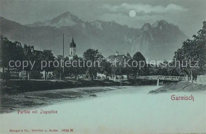 Garmisch-Partenkirchen mit Zugspitze bei Vollmond Garmisch-Partenkirchen postalisch nicht gelaufen bis 1920 Erhaltung siehe scans [LiesaD40] LiesID40