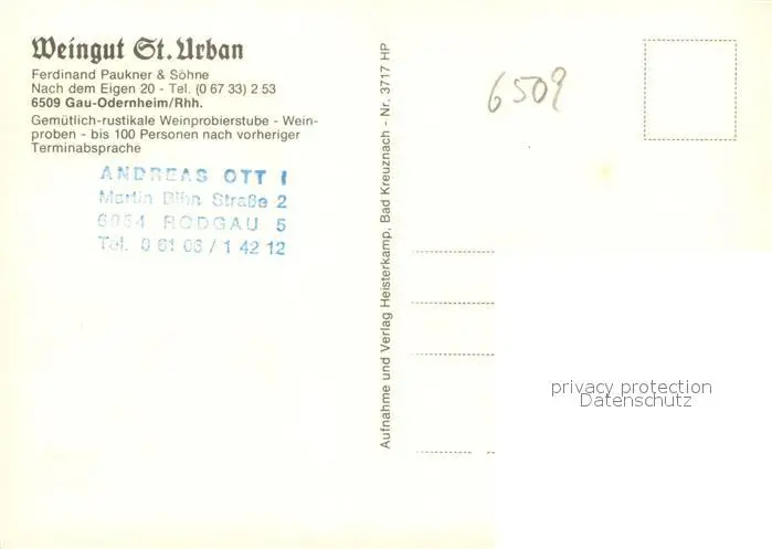 Gau-Odernheim Weingut St. Urban Weinkeller Gastraum Weinlese Gau-Odernheim postalisch nicht gelaufen nach 1965 Erhaltung siehe scans [FriedD77] Frierer