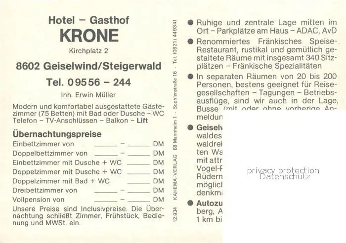 Geiselwind Hotel Gasthof Krone Panorama Gastraum Geiselwind postalisch nicht gelaufen nach 1965 Werbekarte (keine Postkarte) Erhaltung siehe scans [WerneD78] Werbekarte (keine Postkarte) WernPID7