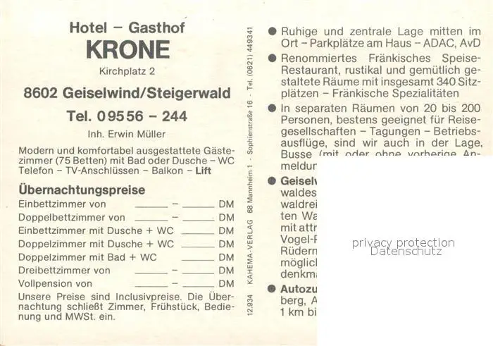 Geiselwind Hotel Gasthof Krone Restaurant Ortsansicht Geiselwind postalisch nicht gelaufen nach 1965 Werbekarte (keine Postkarte) Erhaltung siehe scans [FriedD77] Werbekarte (keine Postkarte) Frierer