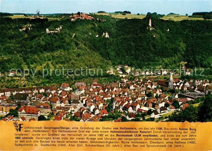 AK / Ansichtskarte Geislingen_Steige Stadtpanorama mit oedenturm Burgruine Helfenstein Chronik Fuenftaelerstadt Geislingen_Steige