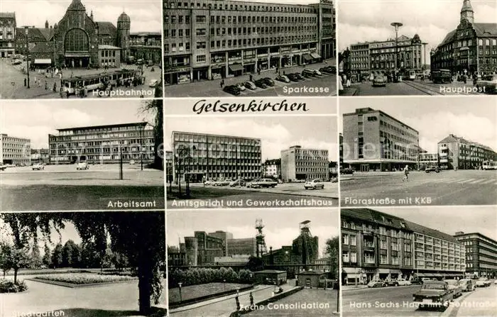 AK / Ansichtskarte Gelsenkirchen Hauptbahnhof Sparkasse Hauptpost Arbeitsamt Amtsgericht Florastrasse Stadtgarten Zeche Consolidation Hans Sachs Haus Gelsenkirchen