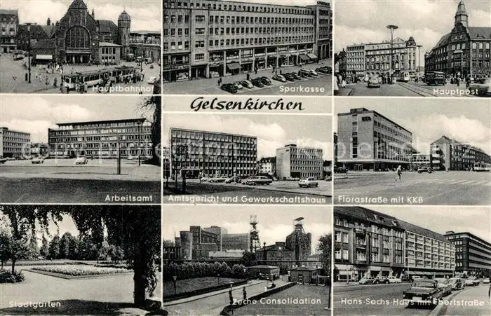 AK / Ansichtskarte Gelsenkirchen Hauptbahnhof Sparkasse Hauptpost Arbeitsamt Stadtgarten Gelsenkirchen