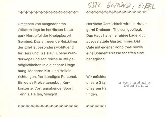 Gemuend_Eifel Cafe Hotel Drehsen Gemuend Eifel postalisch nicht gelaufen nach 1965 Werbekarte (keine Postkarte) Erhaltung siehe scans [KathaD81] Werbekarte (keine Postkarte) Kathoren