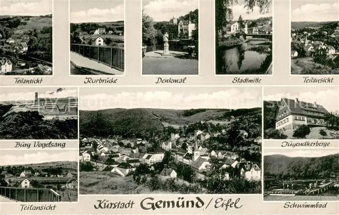Gemuend_Eifel Teilansichten Kurstadt Denkmal Rurbruecke Burg Vogelsang Jugendherberge Schwimmbad Panorama Gemuend Eifel postalisch gelaufen 1960 Erhaltung siehe scans [FriedD77] Frierer