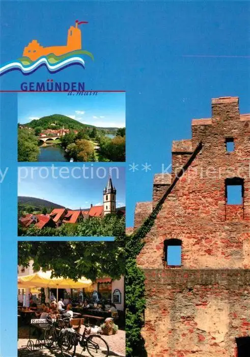 AK / Ansichtskarte Gemuenden_Main Panorama Dreifluessestadt Kirche Restaurant Burgruine Gemuenden Main