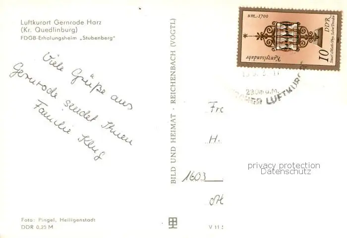 Gernrode_Harz FDGB Erholungsheim Stubenberg Gernrode Harz postalisch gelaufen nach 1965 Erhaltung siehe scans [WerneD78] WernPID7