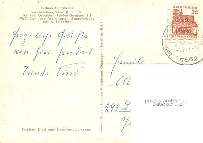 Gernsbach Kurhaus Kaltenbronn Gernsbach postalisch gelaufen 1967 Erhaltung siehe scans [WerneD78] WernPID7
