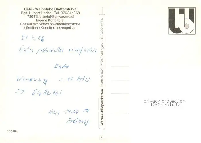 Glottertal Café Weinstube Glotterstueble Glottertal postalisch nicht gelaufen 1996 Erhaltung siehe scans [FriedD77] Frierer