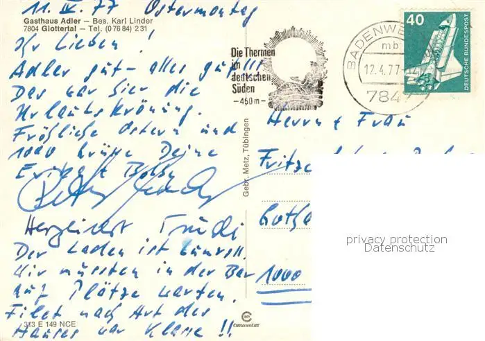 Glottertal_Schwarzwald Gasthaus Adler postalisch gelaufen 1977 Erhaltung siehe scans [FriedD77] Frierer