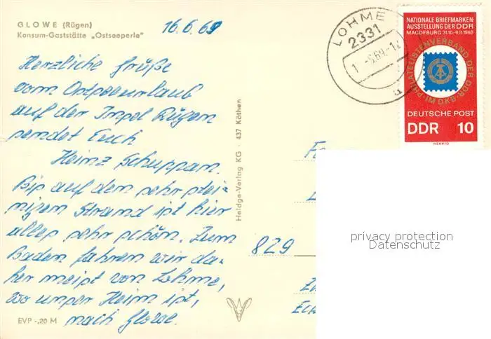 Glowe_Ruegen Konsum Gaststaette Ostseeperle Glowe Ruegen postalisch gelaufen 1969 Erhaltung siehe scans [FriedD77] Frierer