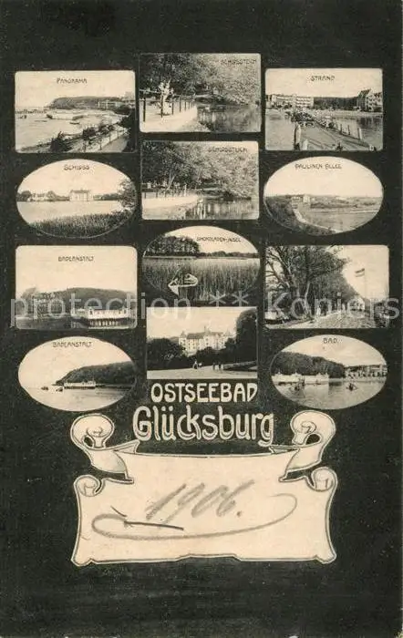 Gluecksburg_Ostseebad Schloss Strand Schlossteich Badeanstaldt Gluecksburg_Ostseebad postalisch gelaufen 1906 Erhaltung siehe scans [KathaD81] Kathoren