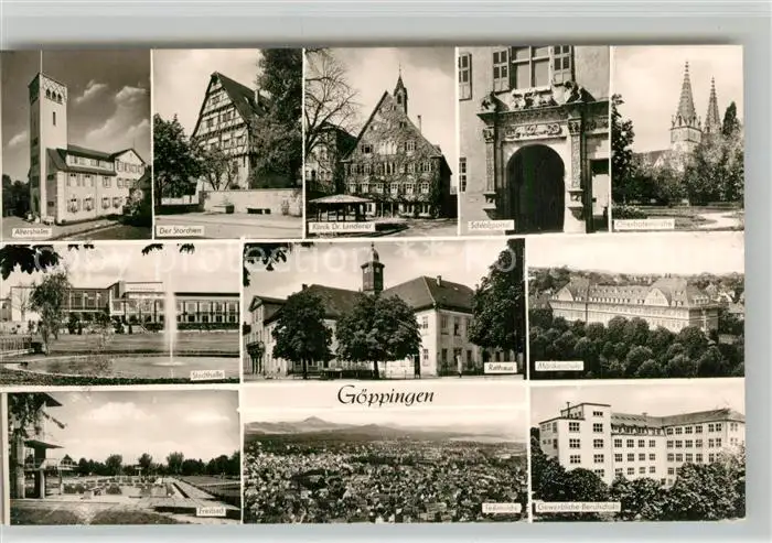 AK / Ansichtskarte Goeppingen Altersheim Fachwerkhaus Klinik Schloss Kirche Stadthalle Rathaus Schule Freibad Panorama Goeppingen