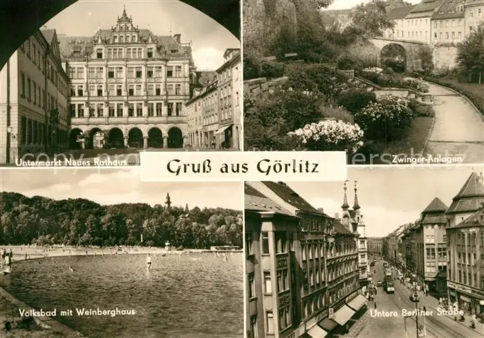 AK / Ansichtskarte Goerlitz_Sachsen Untermarkt Neues Rathaus Zwinger Anlagen Volksbad Weinberghaus Untere Berliner Strasse Goerlitz Sachsen