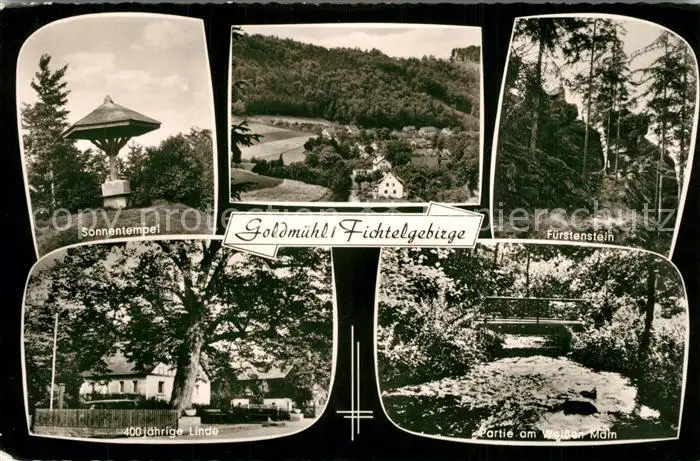 AK / Ansichtskarte Goldmuehl_Fichtelgebirge Sonnentempel Fuerstenstein 400jaehrige Linde Partie am Weissen Main Goldmuehl Fichtelgebirge