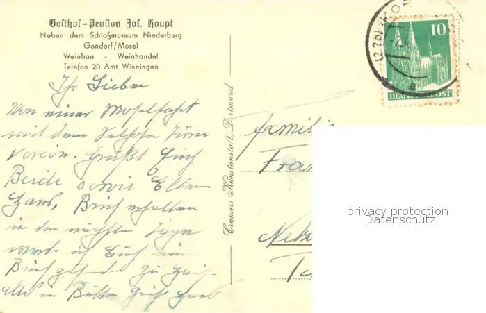 Gondorf Mosel Kategorie Alte Ansichtskarten Postkarten bx93587 Gondorf_Mosel Fliegeraufnahme mit Gasthof Pension Haupt und Schlossmuseum Niederburg Gondorf Mosel postalisch gelaufen Erhaltung siehe scans [WerneD78]