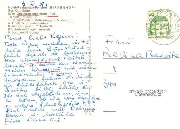 Gossersweiler-Stein Hotel Restaurant Birkenhof Burgen Felsformationen Schule Gossersweiler-Stein postalisch gelaufen 1981 Erhaltung siehe scans [FriedD77] Frierer