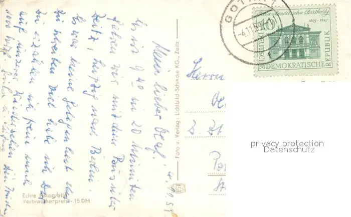 Gotha_Thueringen Museum Hauptmarkt Wirtschaftsschule Orangerie Arnoldiplatz Rathaus Schloss Friedenstein Wasserkunst Gotha Thueringen postalisch gelaufen 1959 Erhaltung siehe scans [WerneD78] WernPID7