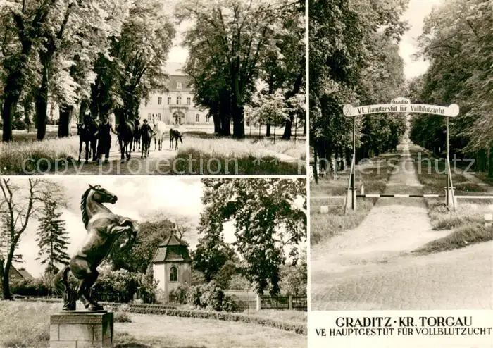 AK / Ansichtskarte Graditz VE Hauptgestuet fuer Vollblutzucht Pferdeskulptur Eingang Graditz