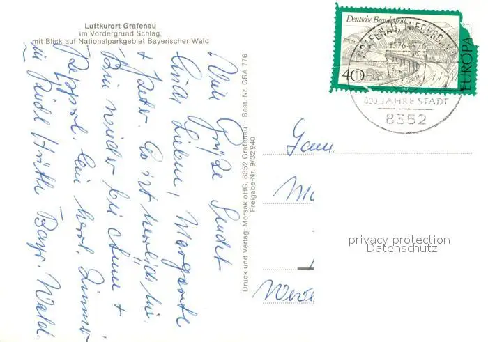 Grafenau_Niederbayern Luftkurort im Vordergrund Schlag Nationalpark Bayerischer Wald Grafenau Niederbayern postalisch gelaufen 1977 Fliegeraufnahme Erhaltung siehe scans [FriedD77] Fliegeraufnahme Frierer