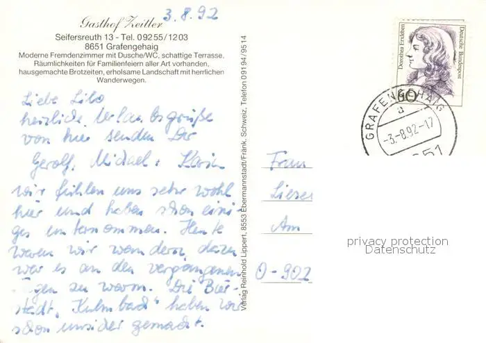 Grafengehaig Gasthof Pension Zeitler Gastraum Fremdenzimmer Panorama Grafengehaig postalisch gelaufen 1992 Erhaltung siehe scans [FriedD77] Frierer