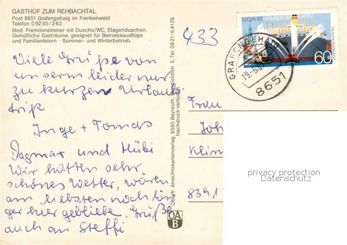 Grafengehaig Gasthof zum Rehbachtal Gaststube Gartenterrasse Grafengehaig postalisch gelaufen 1985 Erhaltung siehe scans [WerneD78] WernPID7