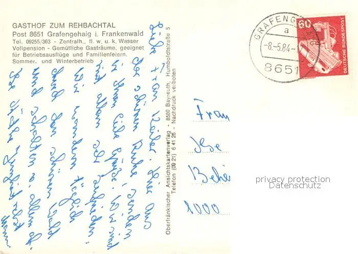Grafengehaig Gasthof zum Rehbachtal Grafengehaig postalisch gelaufen 1984 Erhaltung siehe scans [FriedD77] Frierer