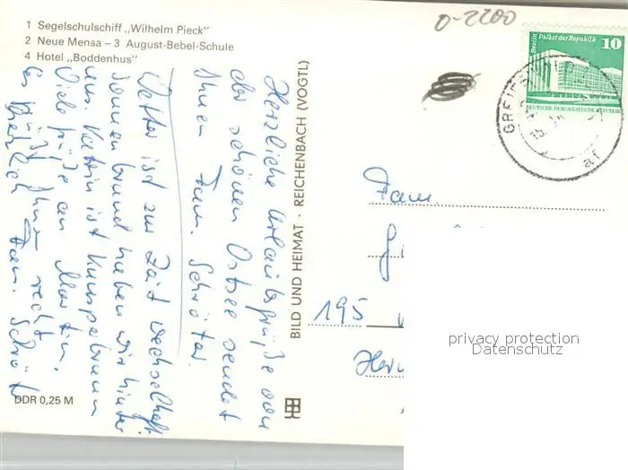 Greifswald Segelschulschiff Wilhelm Pieck Neue-Mensa August-Bebel-Schule Hotel-Boddenhus Greifswald postalisch gelaufen nach 1965 Erhaltung siehe scans [LiesaD40] LiesID40