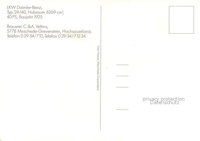 Grevenstein LKW Daimler Benz Typ 24/40 Baujahr 1925 Automobile Brauerei Veltins Grevenstein postalisch nicht gelaufen nach 1965 Erhaltung siehe scans [FriedD77] Frierer
