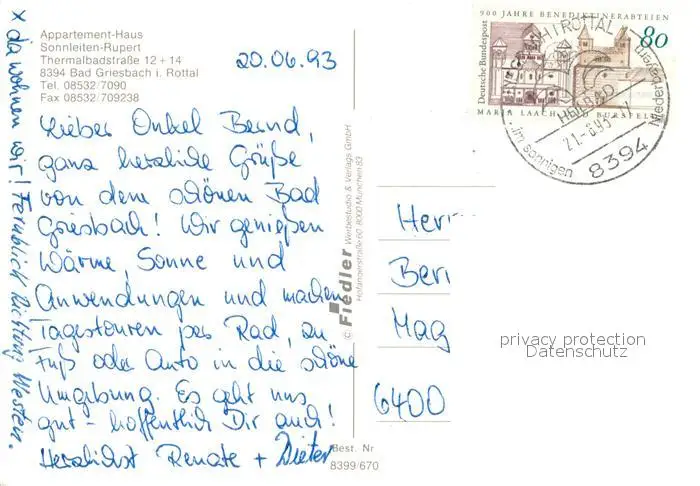 Griesbach_Rottal Appartementhaeuser Sonnleiten Rupert Termalbad Panorama Griesbach Rottal postalisch gelaufen 1993 Erhaltung siehe scans [WerneD78] WernPID7