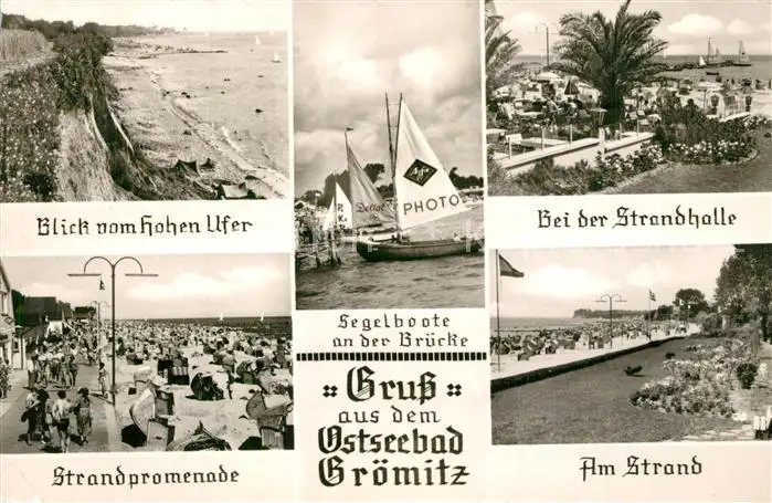 Groemitz_Ostseebad Blick vom Hohen Ufr Segelboote Strandhalle Strandpromenade Strandpartie Groemitz_Ostseebad postalisch gelaufen 1961 Erhaltung siehe scans [WerneD78] WernPID7