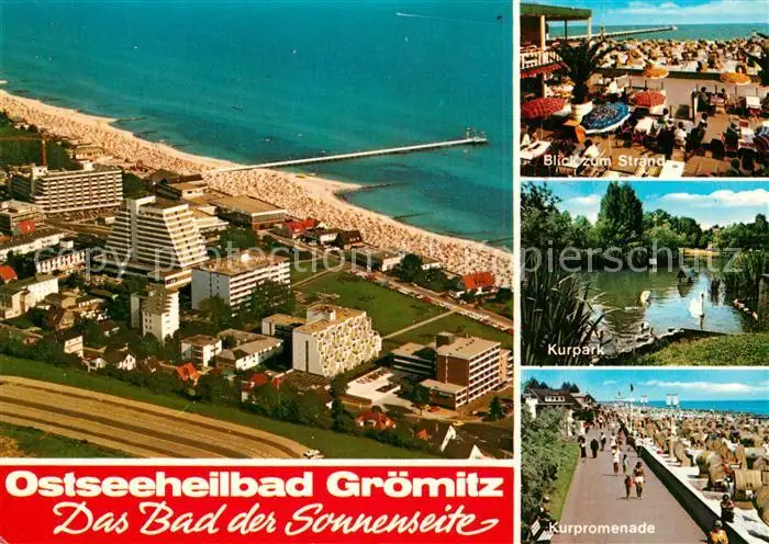 AK / Ansichtskarte Groemitz_Ostseebad Fliegeraufnahme Strand Kurpark Promenade Groemitz_Ostseebad