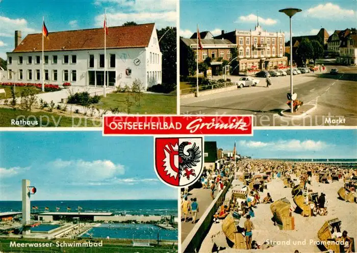 AK / Ansichtskarte Groemitz_Ostseebad Markt Rathaus Meerwasser Schwimmbad Groemitz_Ostseebad