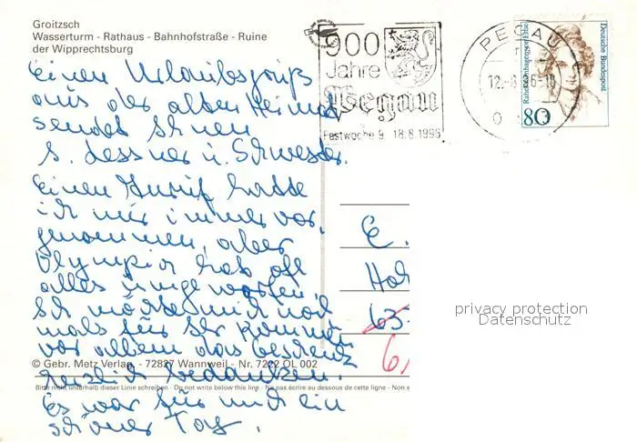 Groitzsch_Pegau Wasserturm Rathaus Bahnhofstrasse Ruine Wipprechtsburg Groitzsch Pegau postalisch gelaufen 1986 Erhaltung siehe scans [FriedD77] Frierer