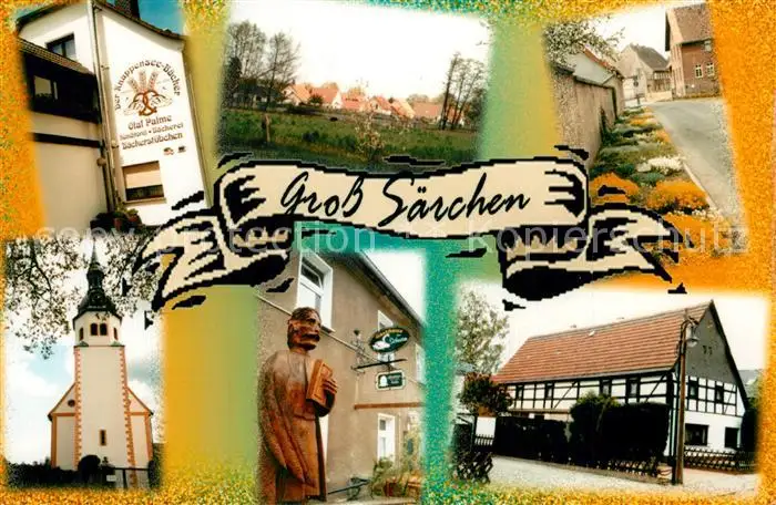 Gross_Saerchen Baeckerei Kirche Statue Denkmal Fachwerkhaus Ortsmotiv Gross Saerchen postalisch nicht gelaufen nach 1965 Erhaltung siehe scans [FriedD77] Frierer