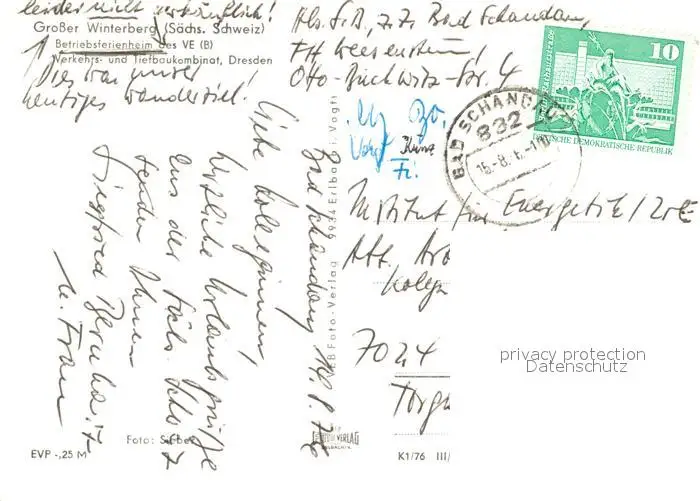 Grosser_Winterberg Betriebsferienheim des VEB Verkehrs- und Tiefbaukombinat Dresden Terrasse Grosser Winterberg postalisch gelaufen 1976 Erhaltung siehe scans [FriedD77] Frierer