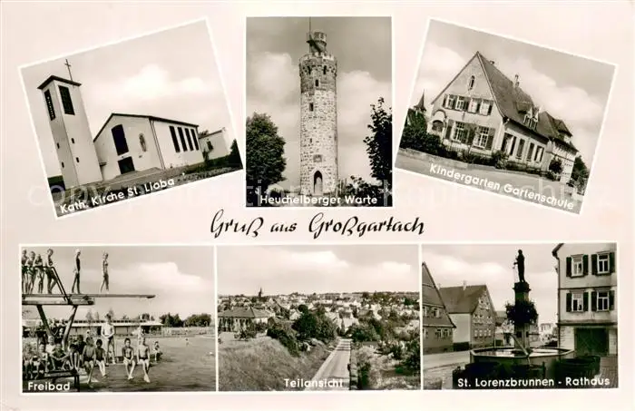 Grossgartach Kirche Heuchelberger Warte Kindergarten Gartenschule Brunnen Rathaus Freibad Grossgartach postalisch gelaufen 1960 Erhaltung siehe scans [FriedD77] Frierer