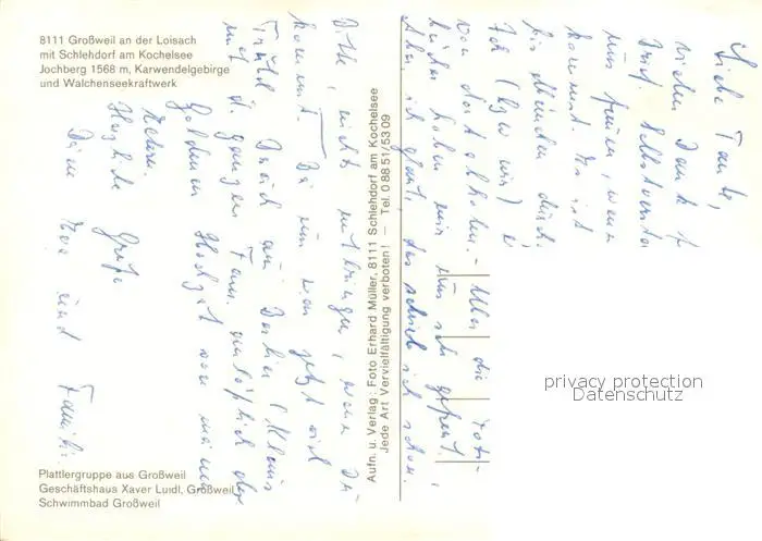 Grossweil Panorama mit Schlehdorf am Kochelsee Jochberg Karwendelgebirge Walchenseekraftwerk Plattlergruppe Trachten Geschaeftshaus Schwimmbad Grossweil postalisch nicht gelaufen nach 1965 Erhaltung siehe scans [FriedD77] Frierer