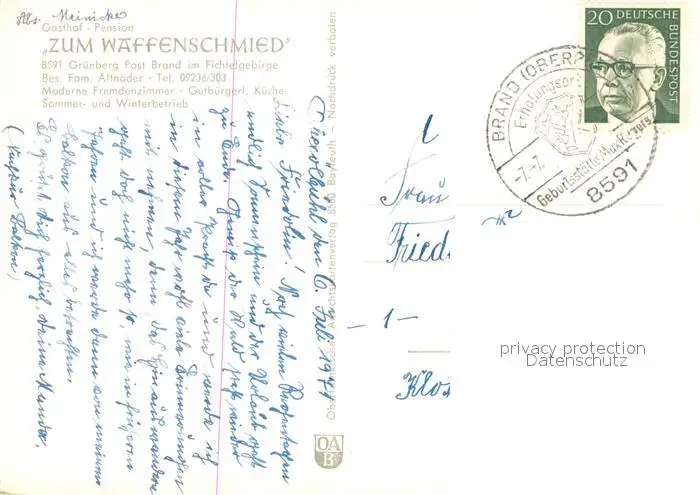 Gruenberg_Oberpfalz Gasthof Pension zum Waffenschmied Resetaurant Partie am Bach Gruenberg Oberpfalz postalisch gelaufen 1971 Erhaltung siehe scans [FriedD77] Frierer