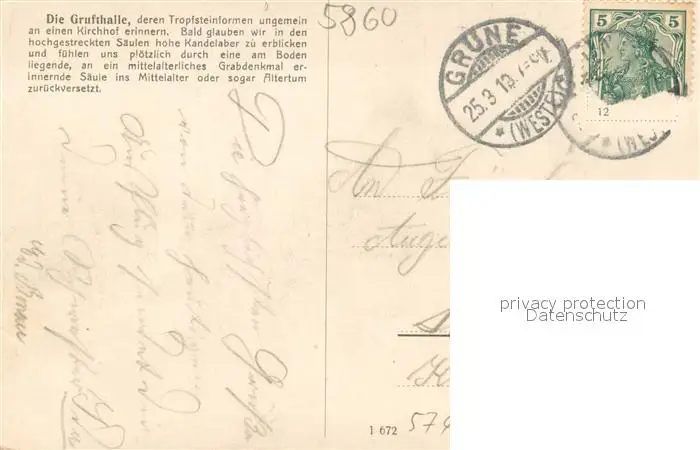 Gruene_Iserlohn Dechenhoehle Grufthalle Tropfsteine Gruene Iserlohn postalisch gelaufen 1913 Erhaltung siehe scans [LiesaD40] LiesID40