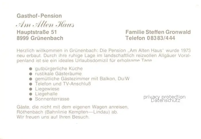 Gruenenbach_Allgaeu Gasthof Pension Am Alten Haus Gruenenbach Allgaeu postalisch nicht gelaufen nach 1965 Werbekarte (keine Postkarte) Erhaltung siehe scans [FriedD77] Werbekarte (keine Postkarte) Frierer