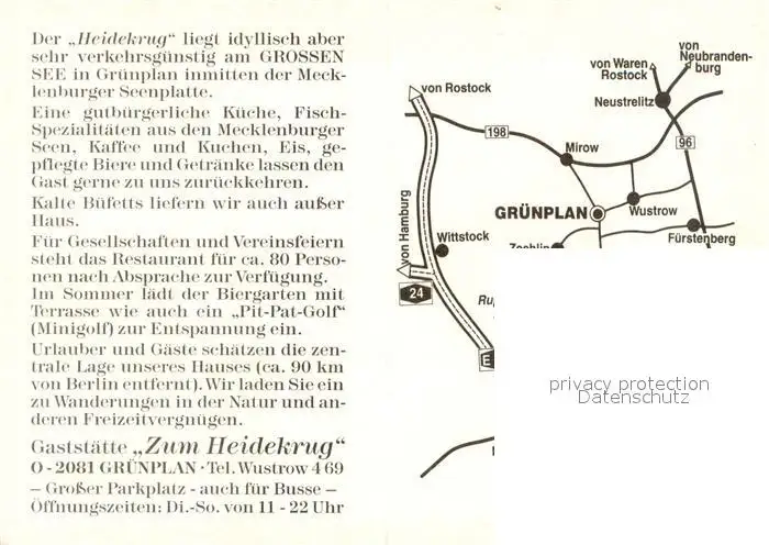 Gruenplan Gaststaette Zum Heidekrug Grosser See Gruenplan postalisch nicht gelaufen nach 1965 Werbekarte (keine Postkarte) Erhaltung siehe scans [FriedD77] Werbekarte (keine Postkarte) Frierer