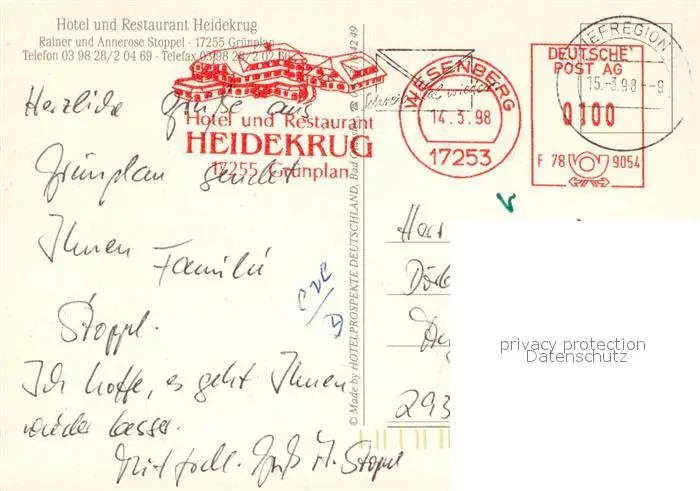 Gruenplan Hotel Restaurant Heidekrug am See Gruenplan postalisch gelaufen 1998 Erhaltung siehe scans [FriedD77] Frierer