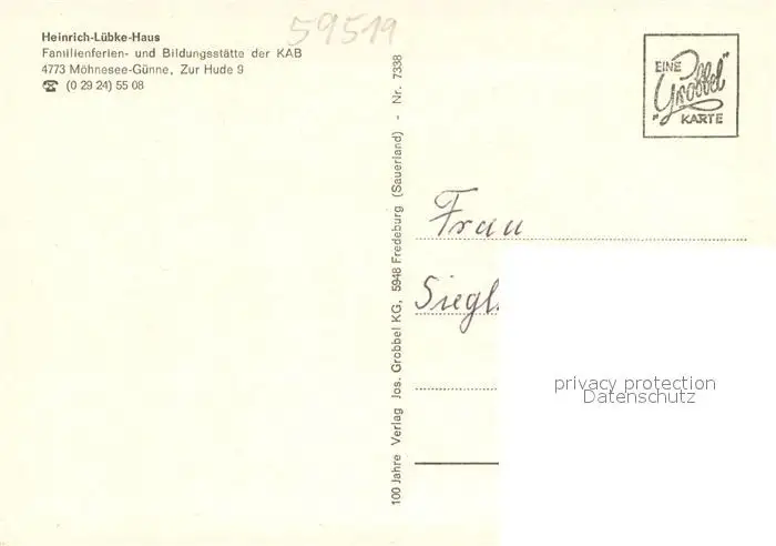 Guenne Heinrich Luebke Haus Familienferien- und Bildungsstaette der KAB Hallenbad Kegelbahn Guenne postalisch nicht gelaufen nach 1965 Erhaltung siehe scans [FriedD77] Frierer