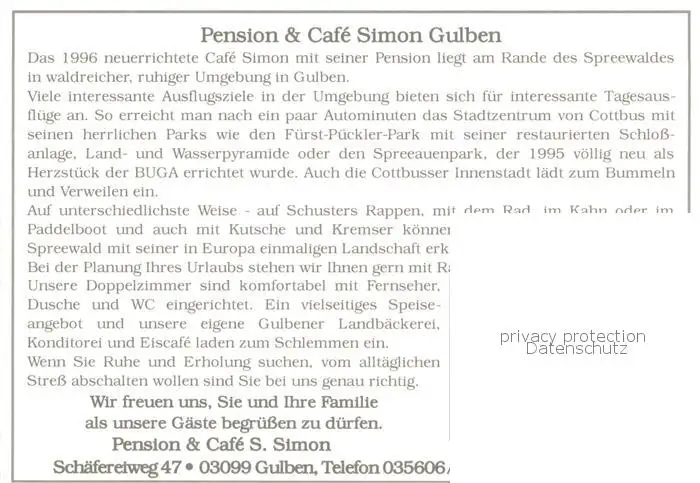 Gulben Pension und Cafe Simon Spreewaldpartie Gulben postalisch nicht gelaufen nach 1965 Werbekarte (keine Postkarte) Erhaltung siehe scans [WerneD78] Werbekarte (keine Postkarte) WernPID7