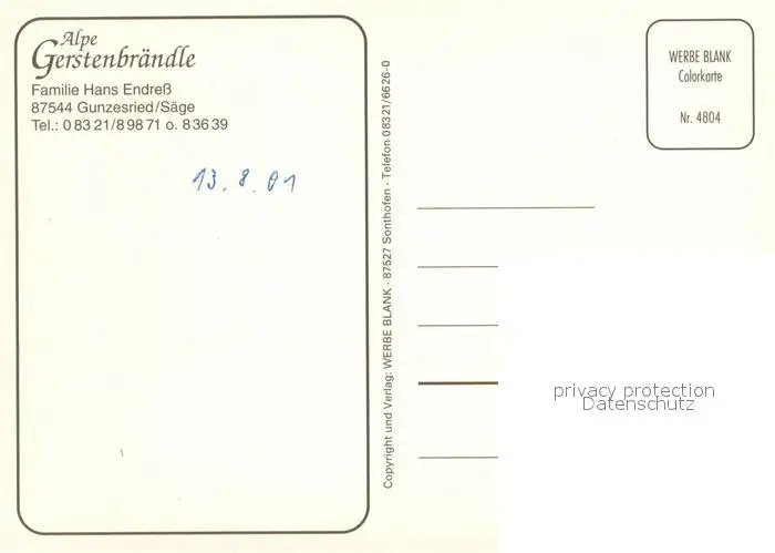 Gunzesried Alpe Gerstenbraendle Gunzesried Saege Gaststube Kaeserei Gunzesried postalisch nicht gelaufen 2001 Erhaltung siehe scans [WerneD78] WernPID7