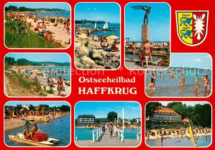 AK / Ansichtskarte Haffkrug_Ostseebad Strand Tretboot Denkmal Seebruecke Hotel Wappen Haffkrug_Ostseebad