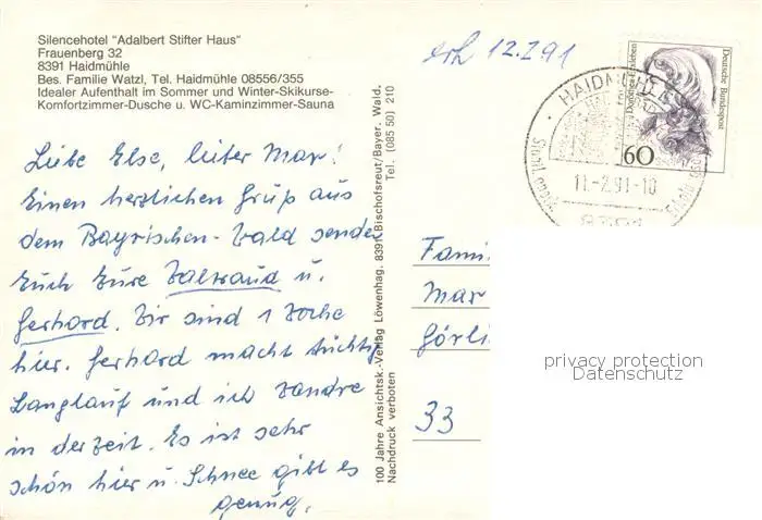 Haidmuehle Silencehotel Adalbert Stifter Haus Panorama Langlaufloipe Gaststube Haidmuehle postalisch gelaufen 1991 Erhaltung siehe scans [WerneD78] WernPID7